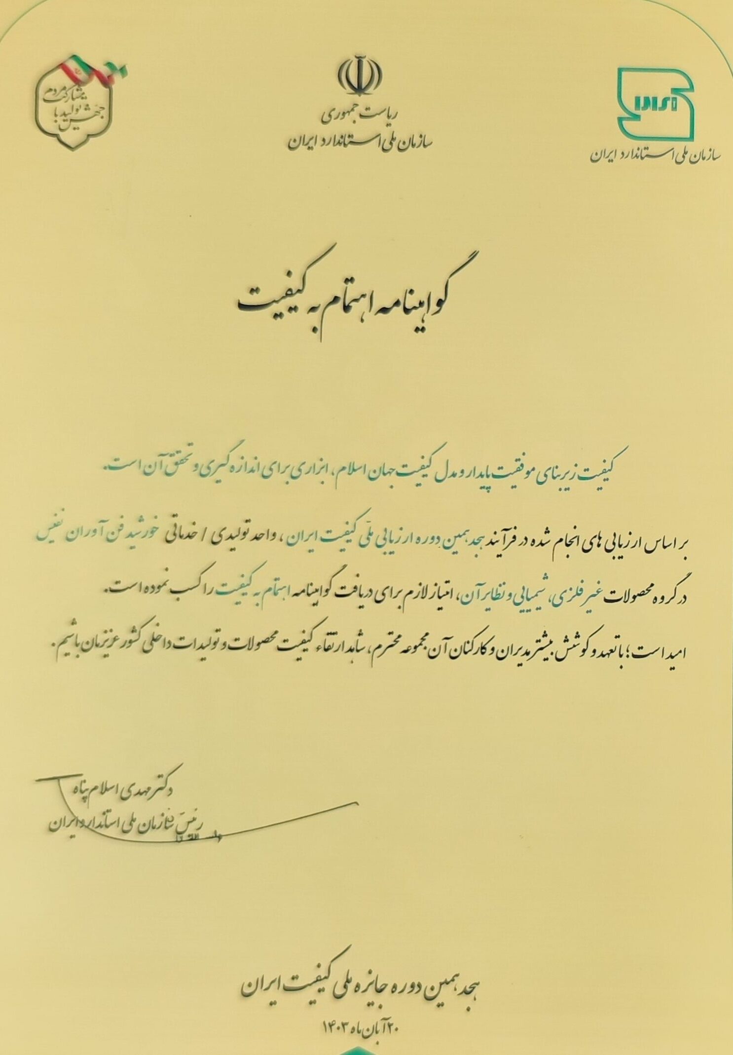 استفاده از مواد اولیه با کیفیت، دستگاه ها و تکنولوژی های پیشرفته در مراحل مختلف ارزیابی، تولید، و بسته بندی منجر به ارائه محصولاتی با کیفیت و بسته بندی رقابتی با محصولات مشابه خارجی شده است. بکارگیری دانش سلولهای بنیادین گیاهی در فرمول ترکیبات تخصصی و تجهیز بخش تحقیق و توسعه با دستگاه های فوق پیشرفته شرکت Courage & Khazaka Electronic GmbH آلمان، جهت ارزیابی اثربخشی محصولات آرایشی و بهداشتی، برگ زرین دیگری از تلاش های متعهدانه متخصصین خورشید فناوران نفیس در جهت بهبود رضایتمندی و اعتمادسازی مصرف کنندگان عزیز با ارائه فرآورده هایی با کیفیت جهانی می باشد. استانداردهای بین المللی مانند CE و ISO 9001 , نشان سیب سبز سلامت از معاونت غذا و دارو، کسب پروانه واحد تحقیق و توسعه از وزارت صمت، و دریافت جایزه ملی کیفیت از سازمان ملی استاندارد ایران، نمونههایی از کیفیت بالا و کنترل کیفیت محصولات تولیدی شرکت خورشید فناوران نفیس هستند.