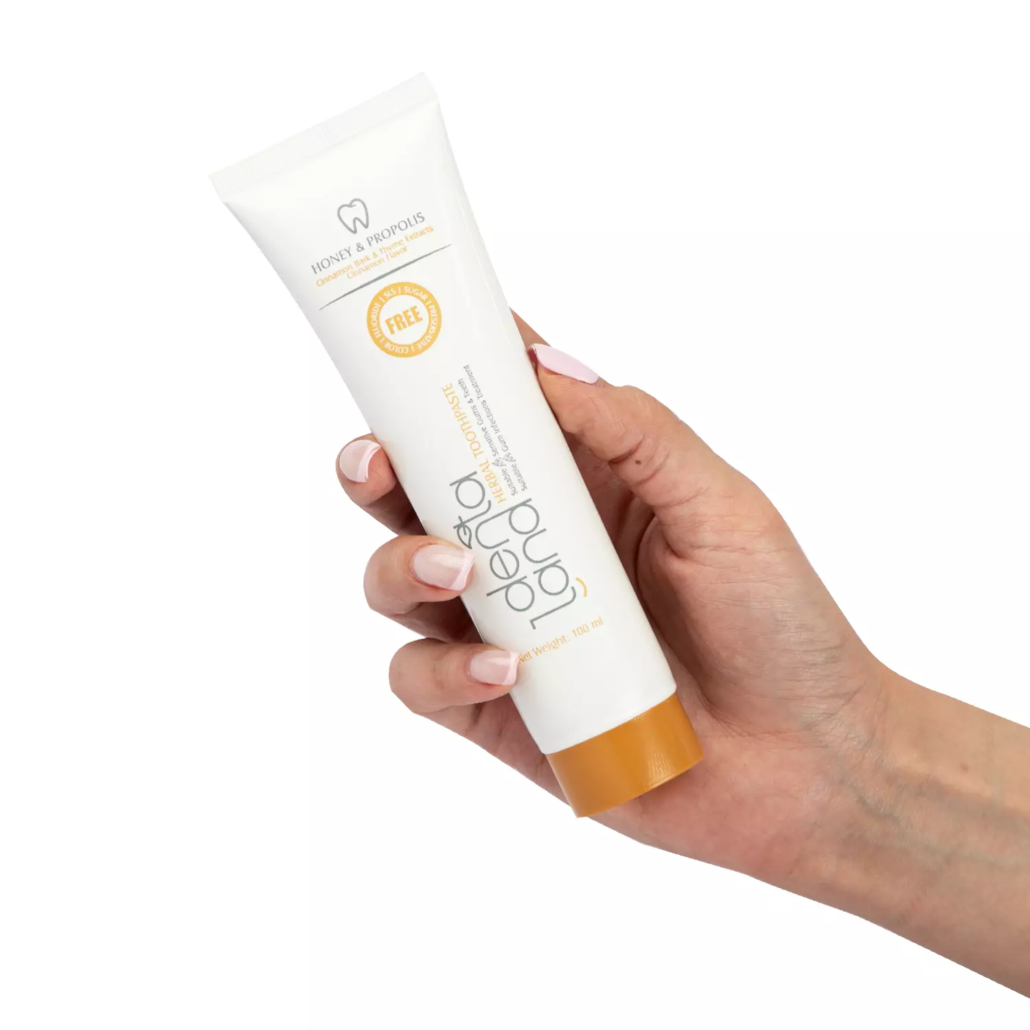 آب دیونیزه، گلیسرین (منشا گیاهی)، ژل آلوئهورا، کربنات کلسیم، عسل، عصاره پوست درخت دارچین، عصاره آویشن، عصاره ریشه گل صابونی، عصاره هل سبز، عصاره ریشه شیرین بیان، عصاره زنجبیل، پودر بره موم، عصاره ساقه چوب مسواک، گوار گام، عصاره شیرین برگ (استویا)